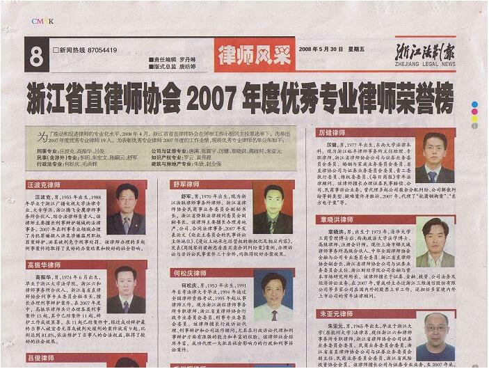 律师的专业化水平,2008年4月,浙江省省直律师协会在评审工作小组民主投票选举下,选举出2007年度优秀专业律师19人。为表彰优秀专业律师2007年度的工作业绩,现将优秀专业律师名单公布如下: