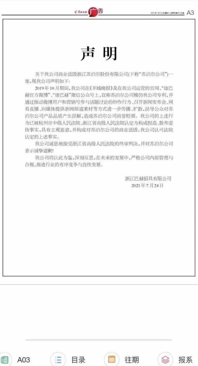 经杭州中院一审、浙江高院二审,浙江高院于2021年6月2日判决浙江巴赫厨具有限公司于本判决送达之日起十五日内在《羊城晚报》A3版(整版)、“康巴赫官网”、“康巴赫官方微博”新浪微博、“康巴赫”微信公众号刊登声明,为浙江苏泊尔股份有限公司消除影响(声明内容需经杭州市中级人民法院审核);于本判决送达之日起十日内赔偿浙江苏泊尔股份有限公司300万元;立即停止传播、编造虚假信息或误导性信息的行为。