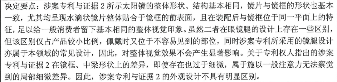 基于上述证据,我们对该专利提起了第一次无效宣告。但是结果让人意外,合议组将目光聚焦到镜框与镜片贴合这个设计要点上,认为“涉案专利的水滴状镜片整体贴合于镜框的前表面,且在装配后与镜框位于同一平面上,这种镜片与镜框的位置关系与常规的嵌入式镜片设计明显不同,是其区别于现有设计的较为显著的设计特征”。在此基础上,合议组还认为侧面的金属全框,眼镜的U行中梁,以及鼻托的设计均有不同程度的区别。最终,维持涉案专利有效。