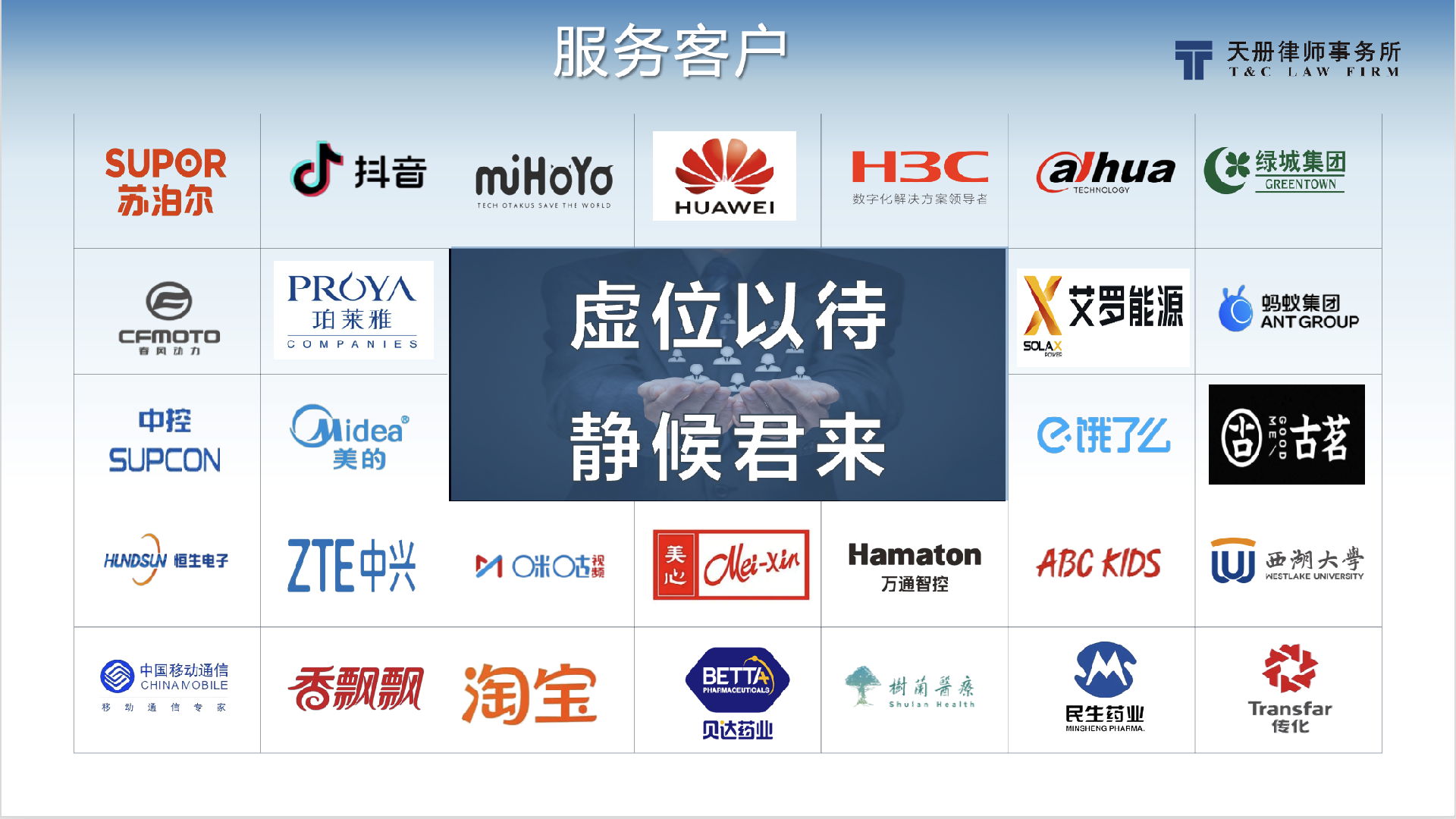 我们代理的客户涉及各个行业不同领域的知名企业,包括华为、字节跳动、抖音、今日头条、剪映、米哈游、天猫、吉利、饿了么、蚂蚁科技、中兴通讯、美心、阿里巴巴达摩院、新华三、苏泊尔、亚厦股份、魅族、美的、大华科技、绿城、咪咕视讯、艾罗能源、传化智联、香飘飘、矽力杰、万通智控、春风动力、浙江中控、金固股份、博联股份、当虹股份、三花股份、珀莱雅、南方中金、永创智能、起步股份、杭州西奥电梯、四川海底捞、顾家家居、树兰医疗、大光明眼镜、新力光源股份、德和绝热股份、君亭酒店、趣睡科技、荣怀教育、衡泰技术股份、银轮股份、古茗科技、浙江移动、会稽山绍兴酒股份、上上签、灵犀互娱、音王电声股份、新宝电器股份、德施曼等。